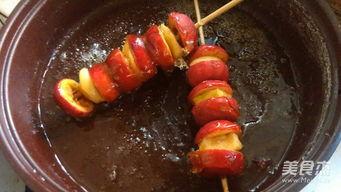 3. 裹糖衣:当糖浆变得浓稠,颜色变深时,迅速将穿好的水果串放入糖浆中,快速翻动,让每一颗水果都裹上糖衣。